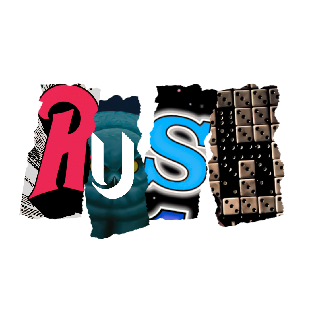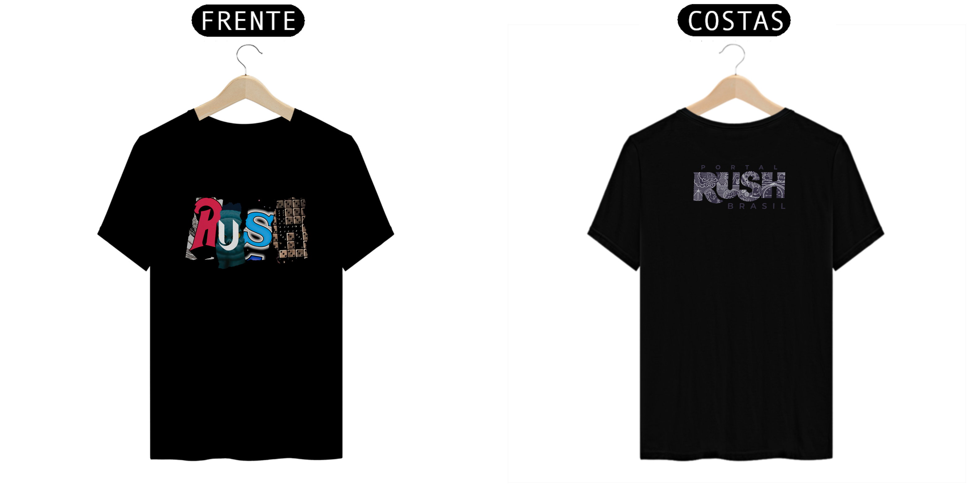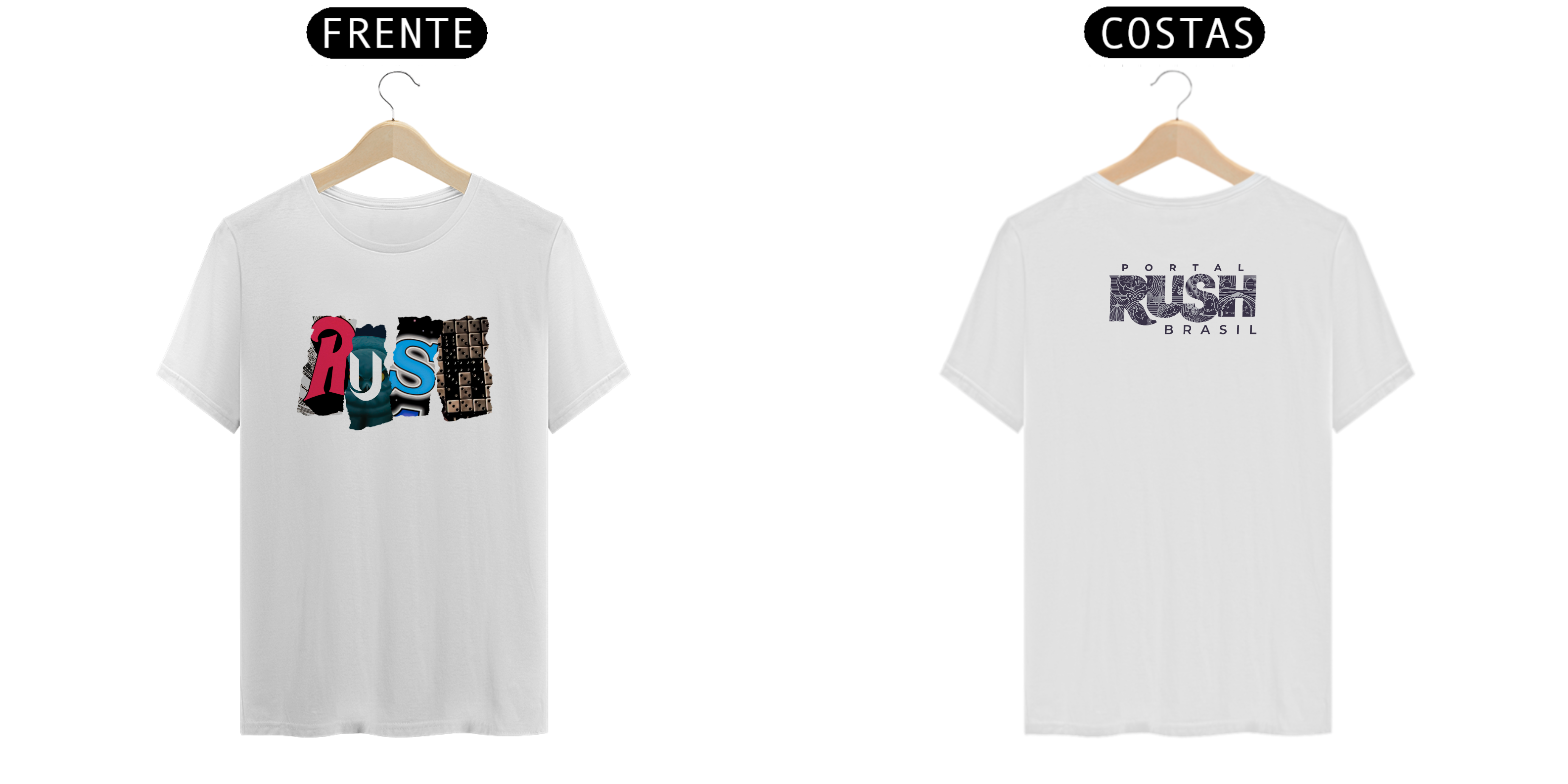 Cada letra da palavra RUSH foi recortada de uma era icônica da banda, formando uma colagem impactante e cheia de referências: