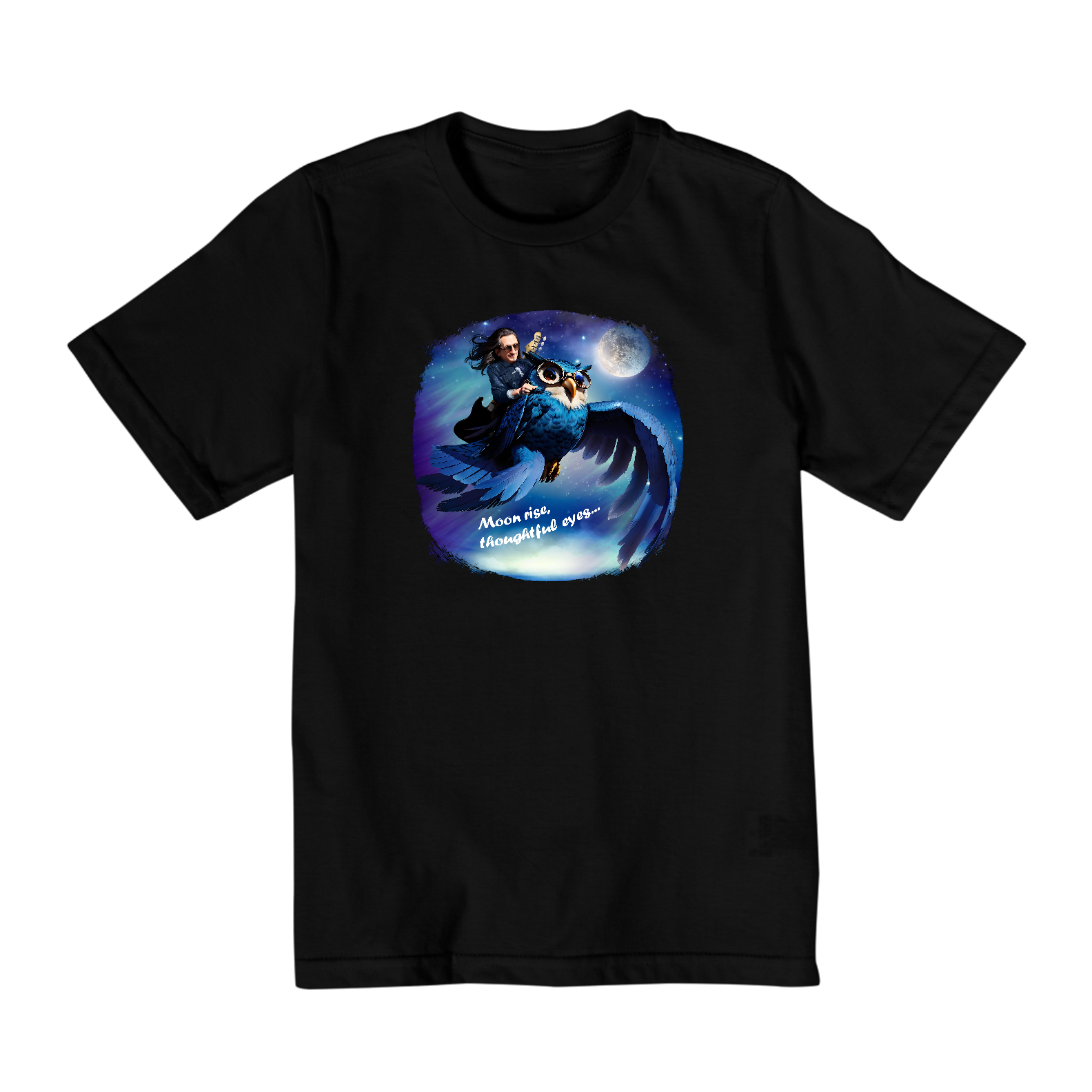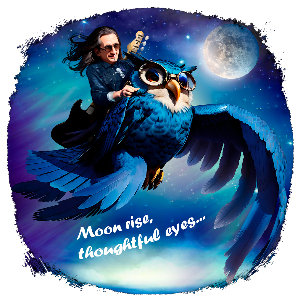 Geddy Lee pega seu baixo e sai voando pela noite com sua corujinha. Modelo para crianças de 2 a 8 anos.